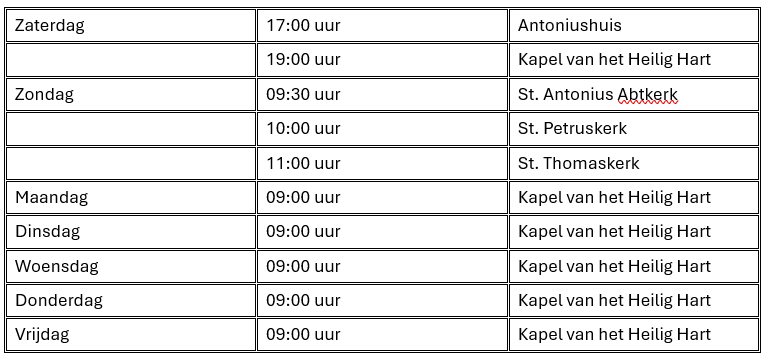 Hieronder vindt u een algemeen overzicht van de Eucharistievieringen in de kerken van onze parochie.